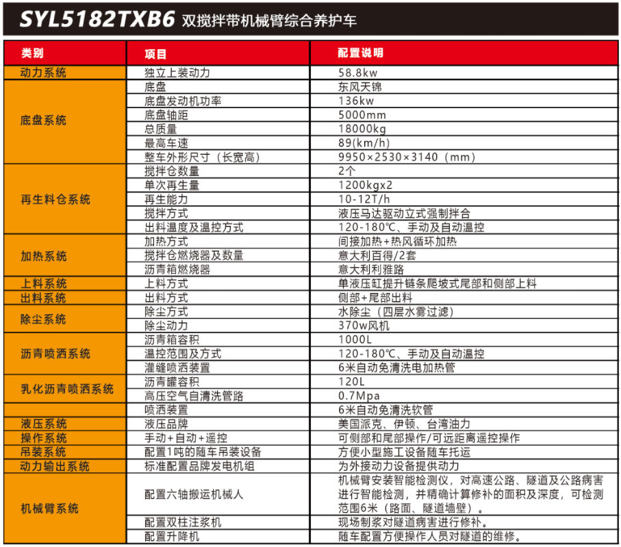 SYL5182TXB6 雙攪拌帶機(jī)械臂路面綜合養(yǎng)護(hù)車是一款集現(xiàn)場生產(chǎn)新瀝青混合料、瀝青路面冷料、舊料、銑刨料 100%現(xiàn)場加熱再生利用 ,熱瀝青灑布、裂紋跟蹤灌縫、乳化 瀝青噴灑、為其他裝置提供電力和液壓動(dòng)力等多種功能于一體的瀝青路面熱再生綜合養(yǎng)護(hù)車。配置智能隧道檢測設(shè)備 ,一車多能 ,完成對公路、隧道病害? (坑槽、裂紋等)? 進(jìn)行智能檢測和快速修補(bǔ)??蓪?shí)現(xiàn)多場合、多路面的各種類養(yǎng)護(hù)作業(yè)。養(yǎng)護(hù)修補(bǔ)費(fèi)用低 ,作業(yè)快捷 ,高效率、節(jié)能環(huán)保性能突出等特點(diǎn)。適用于多種路況的中大施工量和高速公路中的隧道的檢測和修補(bǔ)施工。