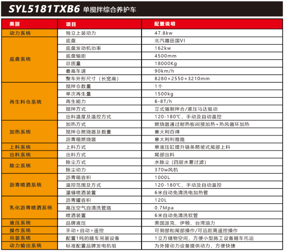 SYL5181TXB6 單攪拌綜合養(yǎng)護(hù)車是一款集現(xiàn)場生產(chǎn)新瀝青混合料、瀝青路面冷料、 舊料、銑刨料100%現(xiàn)場加熱再生利用 ,熱瀝青灑布、裂紋跟蹤灌縫、乳化瀝青噴灑、為其他裝置提供電力和液壓動(dòng)力等多種功能于一體的瀝青路面熱再生綜合養(yǎng)護(hù)車??蓪?shí)現(xiàn)多場合、多路面的各種類養(yǎng)護(hù)作業(yè) ,養(yǎng)護(hù)修補(bǔ)費(fèi)用低 ,作業(yè)快捷 ,高效率、節(jié)能環(huán)保性能突出等特點(diǎn)。適用于遠(yuǎn)郊較寬闊區(qū)域中大施工量和高速公路的修補(bǔ)施工。